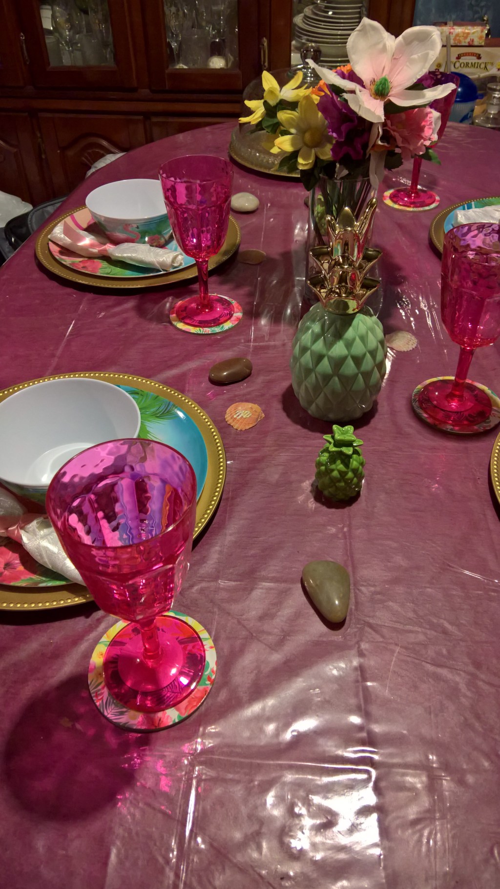 Beautiful table décor for the summer!!!!! From Dollar Tree and Dollar General summer collection I bought everything for a $1.00 from each store. Except the big pineapple that was $5.00. 😁 Beautiful