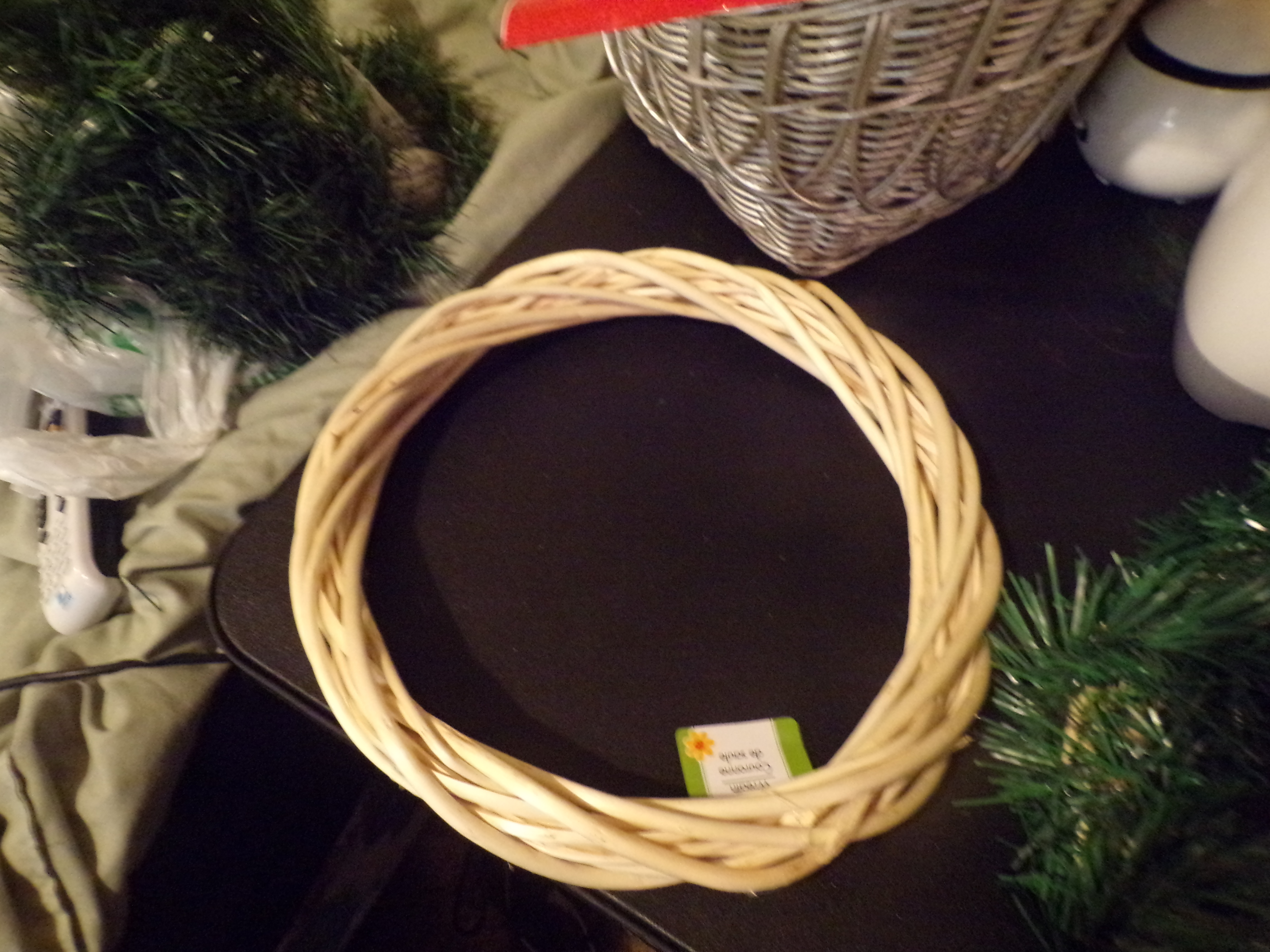 To make a wreath the first thing you need to do is set everything on a table and plug up your hot glue gun. After you do that start putting together your wreath. Picture (below)