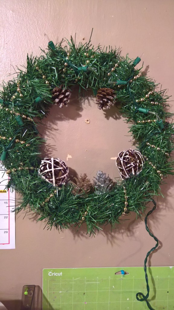 Wrap your garland (above) around the wreath (below) until it is all wrap around. When you finish hot glue gun the end. (Tip: You can also stick the garland in between the wreath stick for it to stick as well.)
