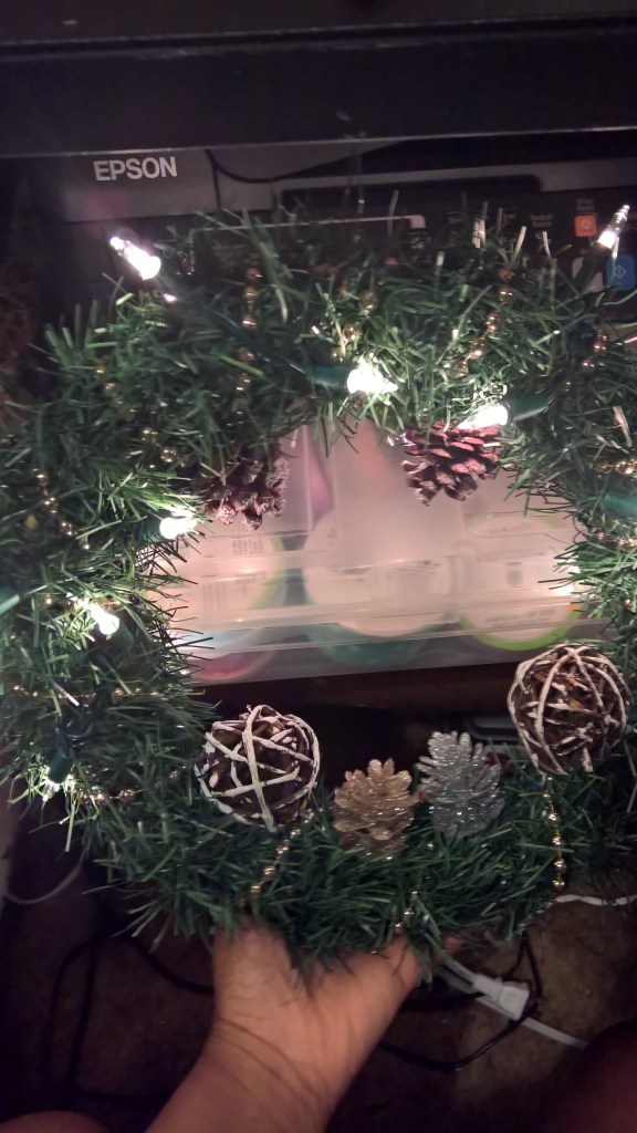 After you finish wrapping your garland around the wreath. Spread the garland on the wreath evenly to make sure its fully covered on the wreath.