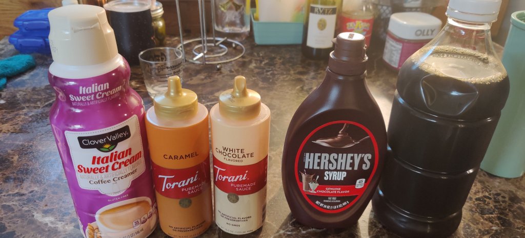 1850 Black Gold Dark Roast Coffee with Sweet Italian Creamer, Caramel, Chocolate and White Chocolate Sauce.