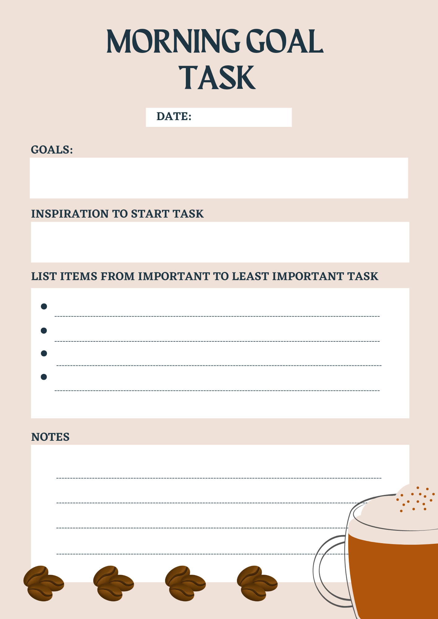 Morning Goal Task $0.99 Morning Goal Task sheet helps you get motivated to start your day with the most important task of the day to the least important task of the day. Grab your Morning Goal Task sheet today!! Description 1 Document.