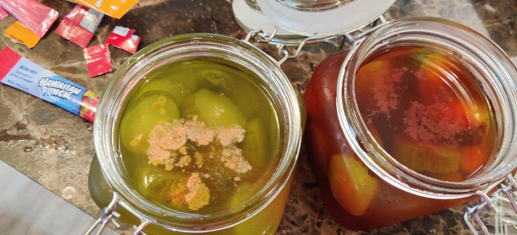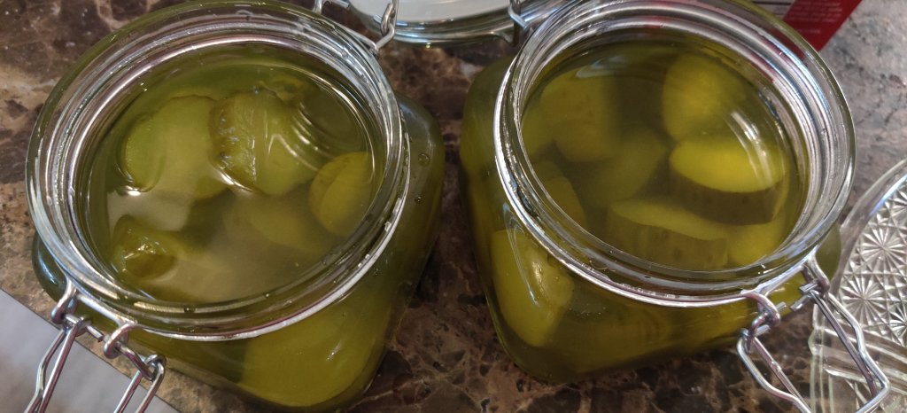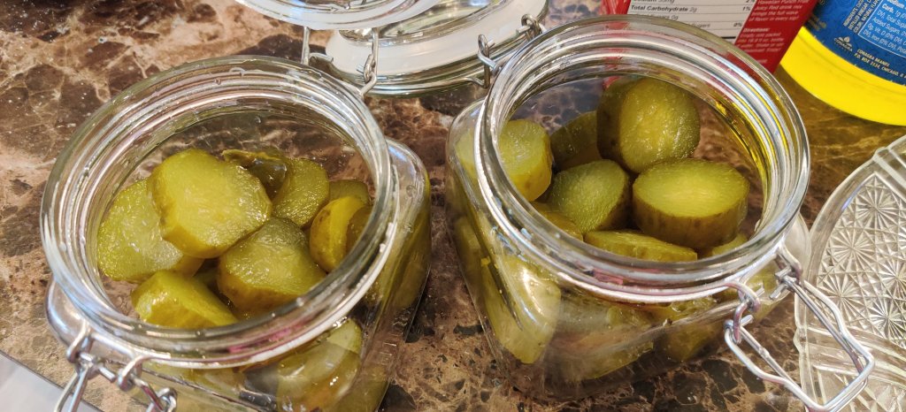 - Pour one cup of pickle juice in one jar and another cup of pickle juice in another.