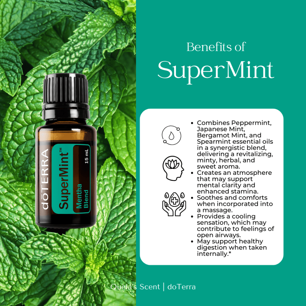 Crisp, clean, and compelling, doTERRA SuperMint brings together CPTG® Peppermint, Japanese Mint, Bergamot Mint, and Spearmint essential oils for a powerfully refreshing blend. When diffused or used topically, doTERRA SuperMint offers an invigorating and energizing aroma, creating an uplifting environment that’s ideal for mental focus and enhanced stamina. Menthol—the primary chemical constituent of doTERRA SuperMint—promotes a cooling sensation when inhaled, which may contribute to feelings of open airways. When applied to the skin during a massage, its cooling effect may be soothing and comforting. This synergistic blend helps freshen the breath and can be taken internally to support a healthy digestive system.*