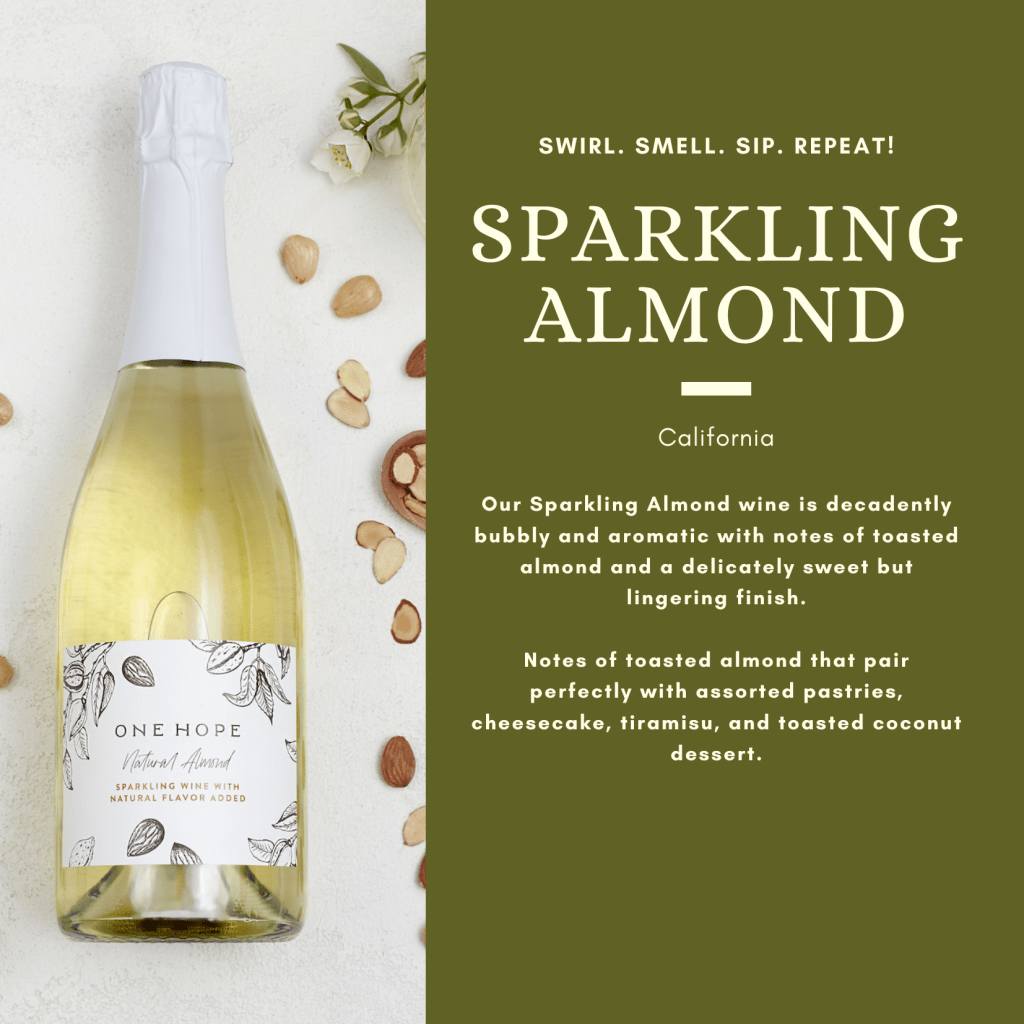 Our Sparkling Almond wine is decadently bubbly and aromatic with notes of toasted almond and a delicately sweet but lingering finish.