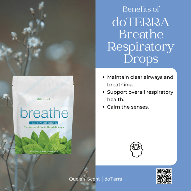 doTERRA Breathe Respiratory Drops combine carefully chosen CPTG Certified Pure Tested Grade® essential oil in respiratory drop form for efficiency and greater ease of use. doTERRA Breathe is a tested and trusted essential oil blend. It helps maintain clear airways and feelings of easy breathing. doTERRA Breathe Respiratory Drops bring together Lemon, Peppermint, Cardamom, Eucalyptus, Thyme, and Melissa essential oils in a great-tasting lozenge, making it more convenient for you as you clean and soothe your airways.