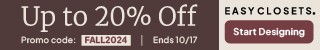 Join EasyClosets’ Fall In Love With Your Closet Sale until 10/17 for up to 20% off custom solutions. Use code FALL2024 for discounts: 15% off purchases over $1,000 and 20% off over $5,000.