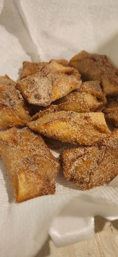 - Sprinkle the cinnamon and sugar mixture over the wontons and enjoy!